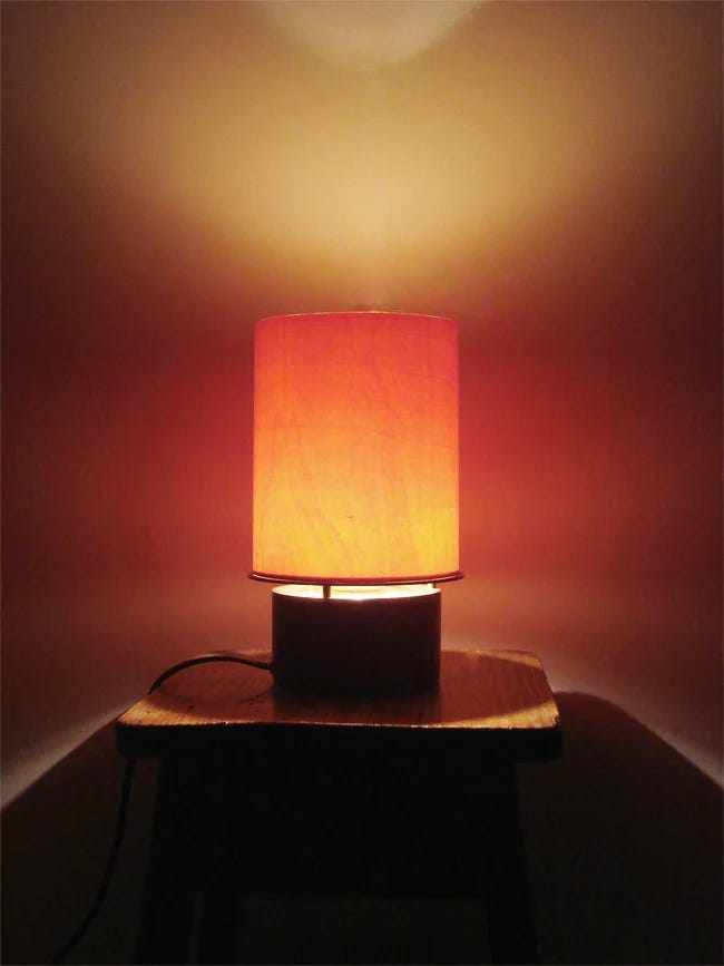This lamp is so niche, and the best lamp ever made in my personal opinion. The reason is it really isn’t a style or design— it is a feeling. The lamp shade is made of a really thin Cherry veneer, so the light it emits is more like the cozy glow of a fire than any man made light.