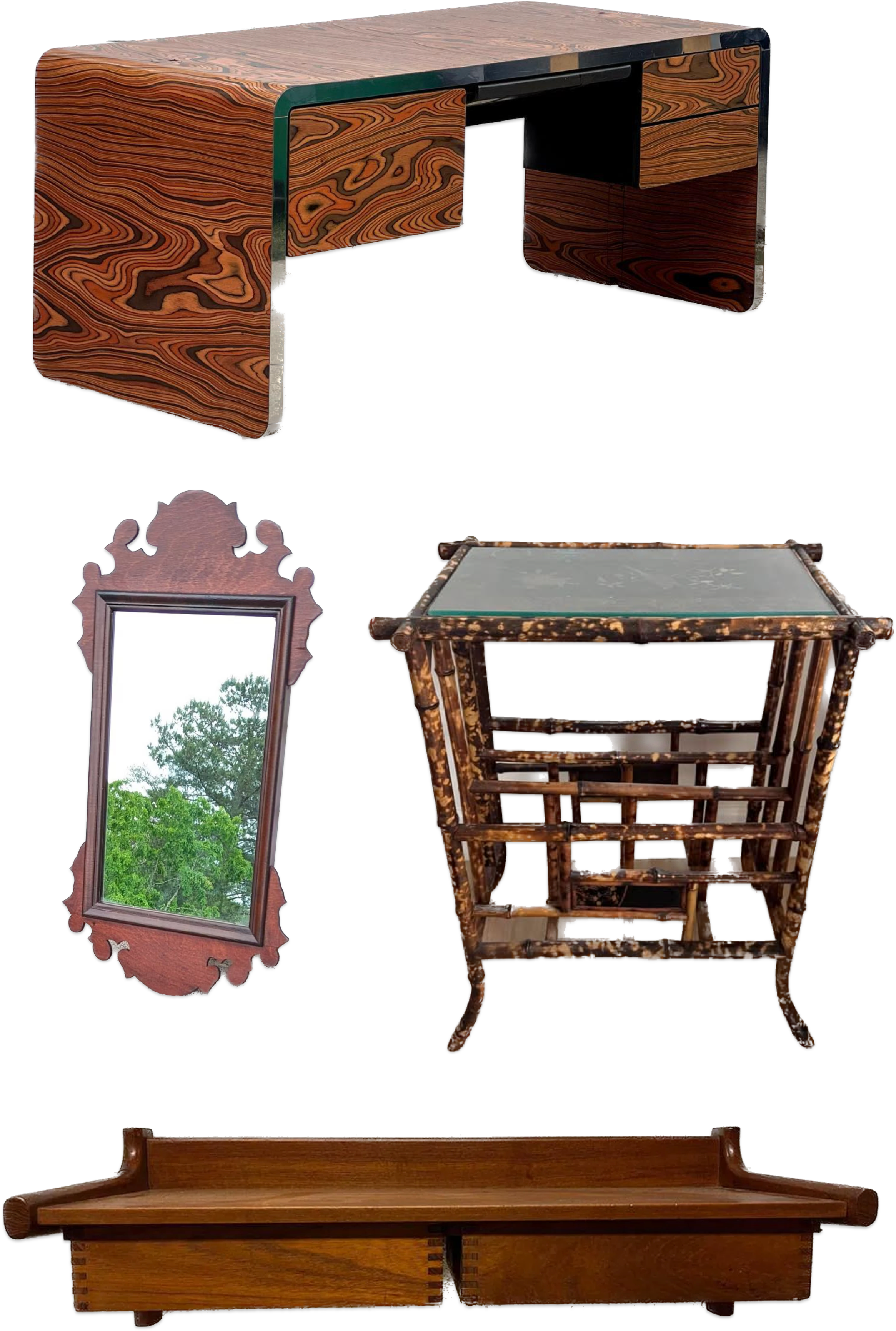 Wood pieces with unique details are the sweet spot — low risk, high impact, and guaranteed to elevate whatever corner they end up in. Cool burned bamboo magazine rack/side table here, cool carved-wood selfie moment here, the perfect Danish floating shelf/ tiny entry unit here,