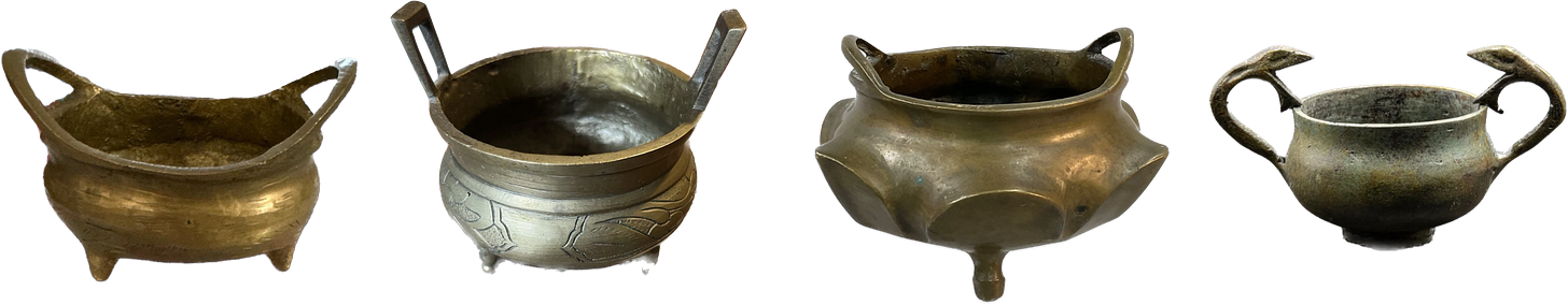 Starting off small but mighty: vintage bronze incense holders. I found one at the thrift store the other day, filled it with black sand, and have been walking around my house like I invented electricity. There is something about a tiny, heavier-than-you-think bronze vessel that instantly makes you feel like a well-traveled intellectual with excellent taste.Shop Greek bronze snake amphora here, quirky armed bronze vessel here, scalloped bronze vessel here, footed piece here.